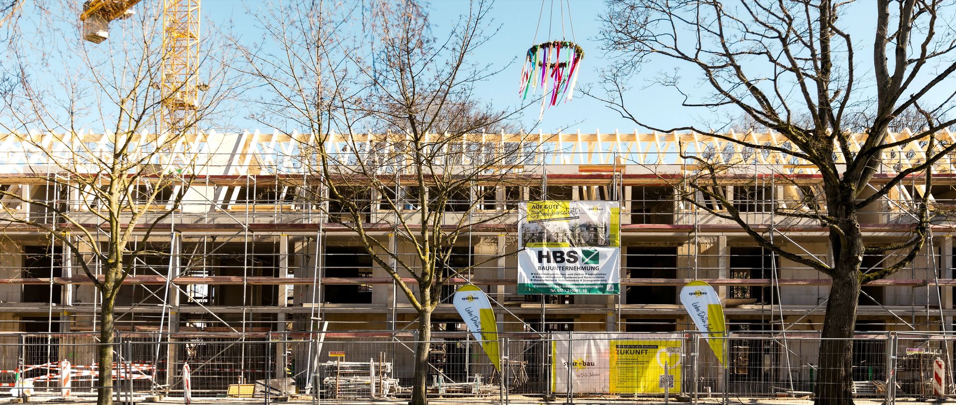 Für die feierliche Rede beim Richtfest stieg spar+bau-Vorstand Rainer Detjen auf das Gerüst des Rohbaus und bedankte sich herzlich bei allen Beteiligten. Detjen lobte den reibungslosen Baufortschritt und den gelungenen Entwurf: „Grundlegende Idee des Gebäudes ist die Laubengangerschließung, sodass dort Kommunikationsflächen entstehen. Denn das ist es ja, was eine Genossenschaft ausmacht: das Gemeinsame, das Miteinander, das Zueinanderfinden.“